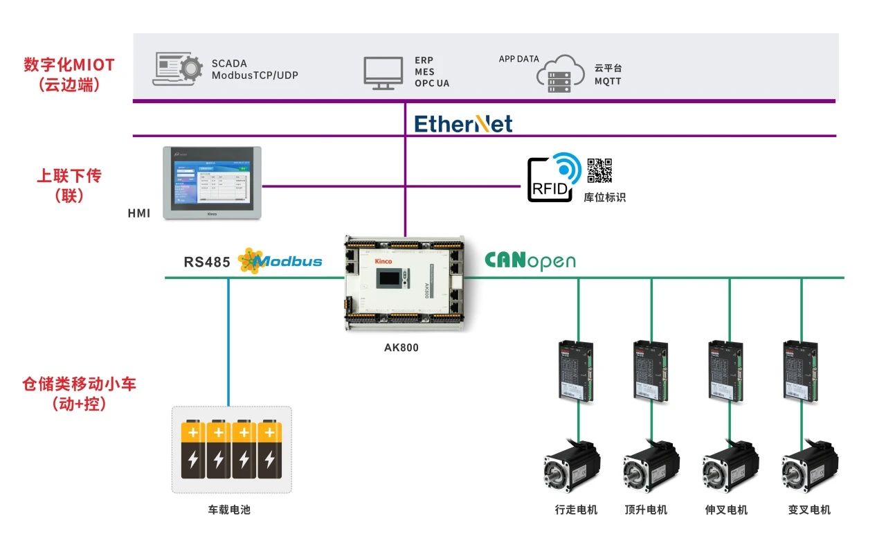 控制器采用CANopen或者EtherCAT总线控制伺服,车辆以及系统状态信息采集到HMI显示,云开网页版物联型HMI支持OPC UA、MQTT、数据库等多种通讯方式,可通过以太网连接至服务器,为数字化提供基础数据。