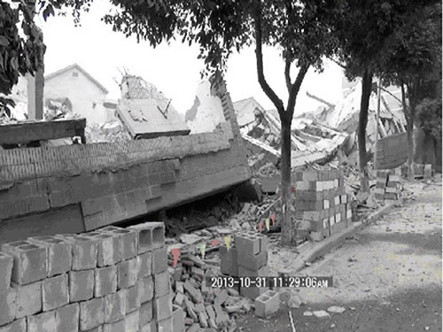 为配合推动德清县三改一拆工作顺利进行,浙江物产京安爆破工程有限公司组织了强有力的施工队伍,精心设计,严密施工。为确保爆破效果和爆破作业安全,设计方案中采用了毫秒延期技术,使大楼爆破后逐栋逐排逐跨分段延期触地,既有助于楼体倾倒触地后的充分解体,也极大的降低了塌落震动影响。同时,在精确控制药量的基础上,对爆体采用包裹防护及隔离防护,以上措施将有效控制爆破飞石危害,以确保安全。爆破后,4幢楼背离英溪北路逐栋向正西方向倾倒,爆堆最大高度约4m,前方倾出约8m,基本无后座,英溪北路在第一时间恢复了交通,爆破结果近乎完美。本次爆破共使用了乳化炸药168kg,各段别非电毫秒雷管5500发,传爆用导爆管5000m。爆破设计方案由核工业井巷建设公司评估,浙江高能爆破工程有限公司负责现场监理。